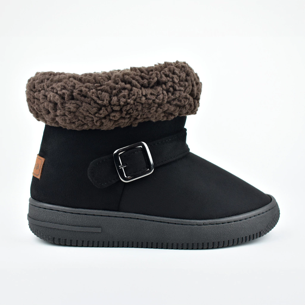 Botinha feminina com fivela decorativa e solado blaqueado.